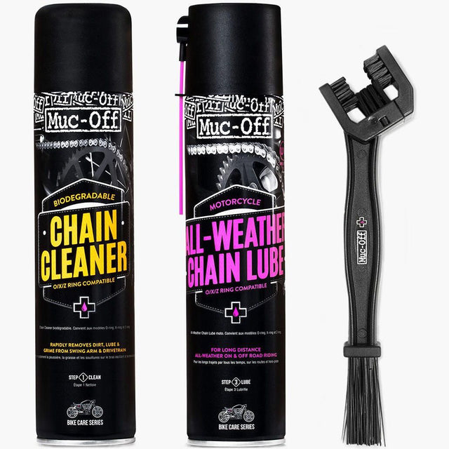 Get ready to kick your bike care into high gear with the Motorcycle Chain Care Kit. This all-in-one grime fighting trio will leave your drivetrain smoother than a slow jam. Packed with Muc-Off's Motorcycle Chain Cleaner, All-Weather Chain Lube, and a Motorcycle Chain Brush, this kit comes with everything you've need to blast dirt and grime to oblivion and keep your chain in top-notch condition, no matter what the weather throws at you.